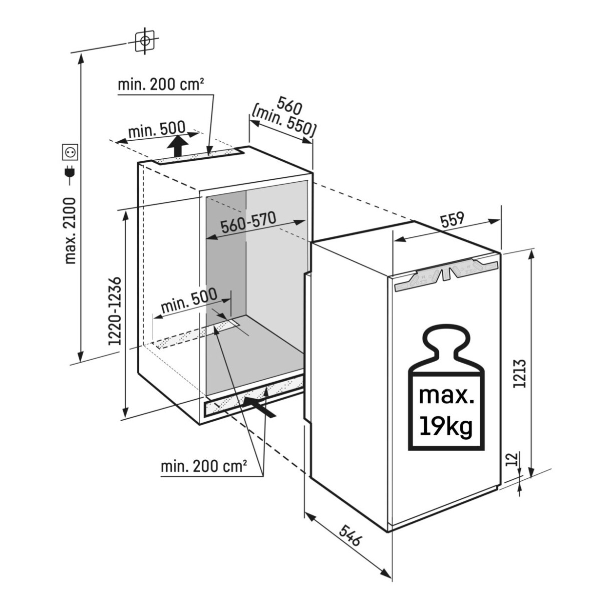 - Szerokość niszy: 56 – 57 cm,