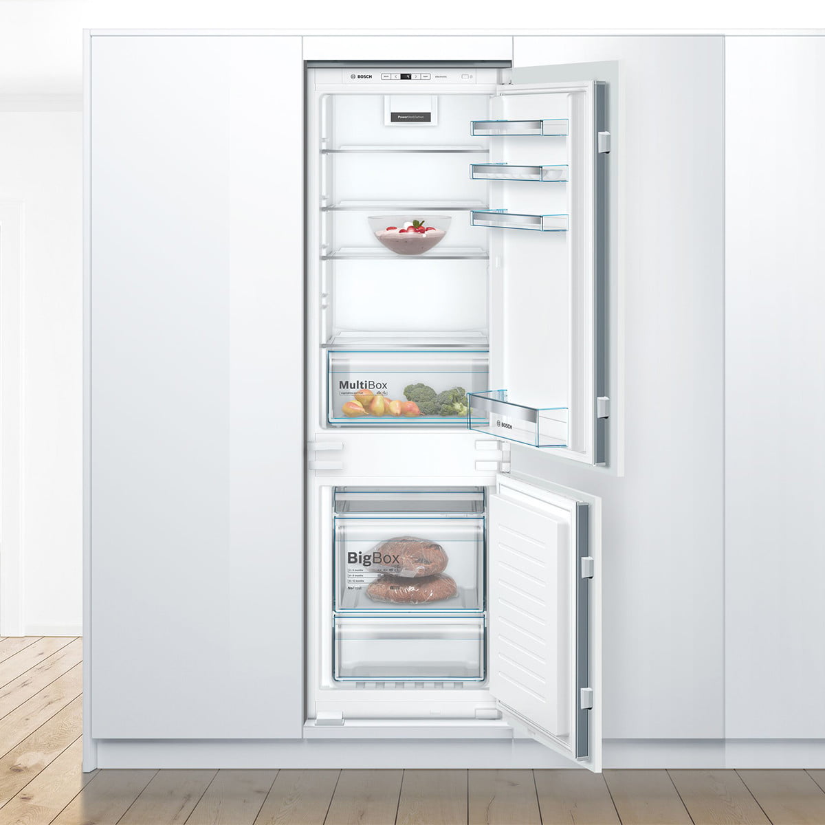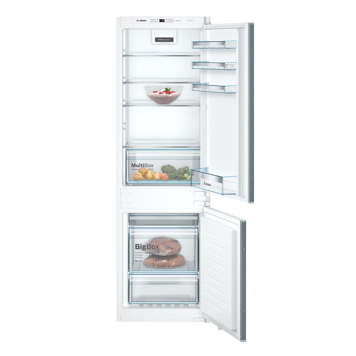 Chłodziarka: 4 szklane półki w tym 3 o regulowanej wysokości. Szuflada MultiBox pojemnik na warzywa z falowanym dnem.