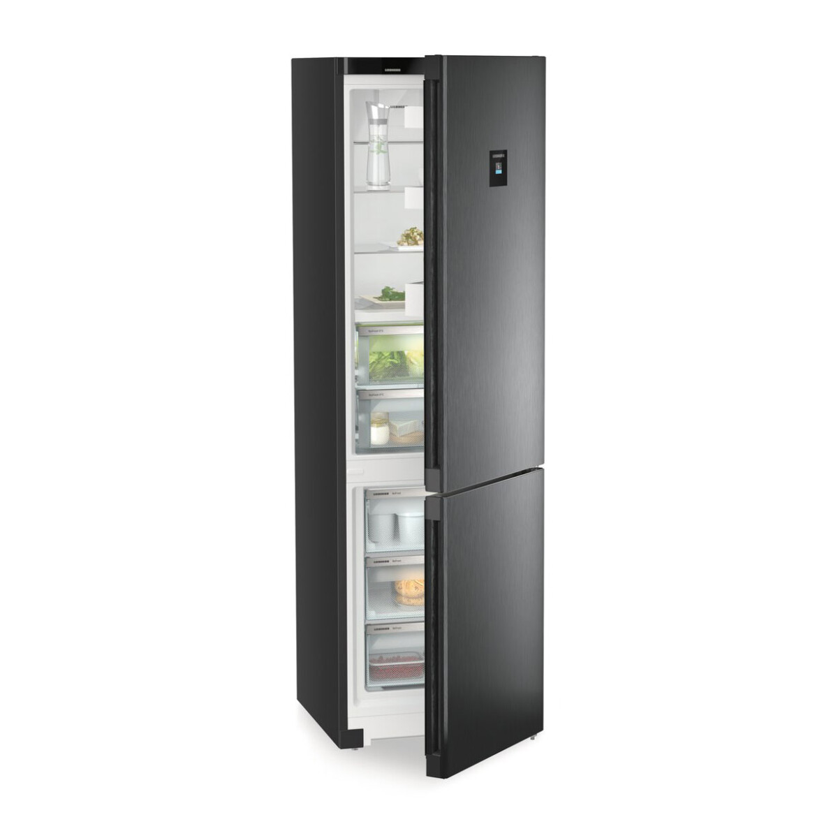 Chłodziarko-zamrażarką wygodnie sterujesz za pomocą dotykowego wyświetlacza TFT lub aplikacji SmartDevice. Eleganckie wykończenie BlackSteel wpasuje się idealnie w nowoczesne kuchnie.