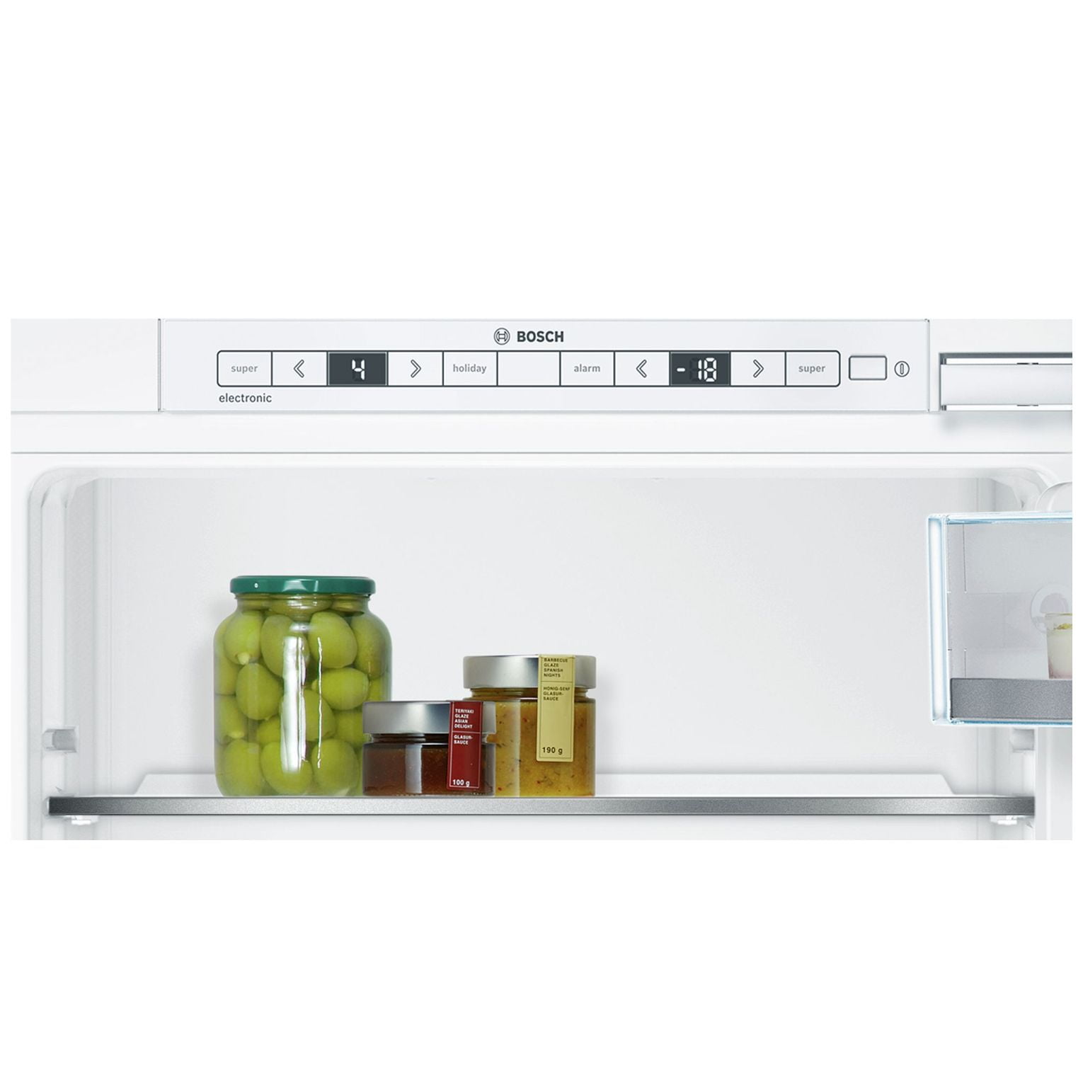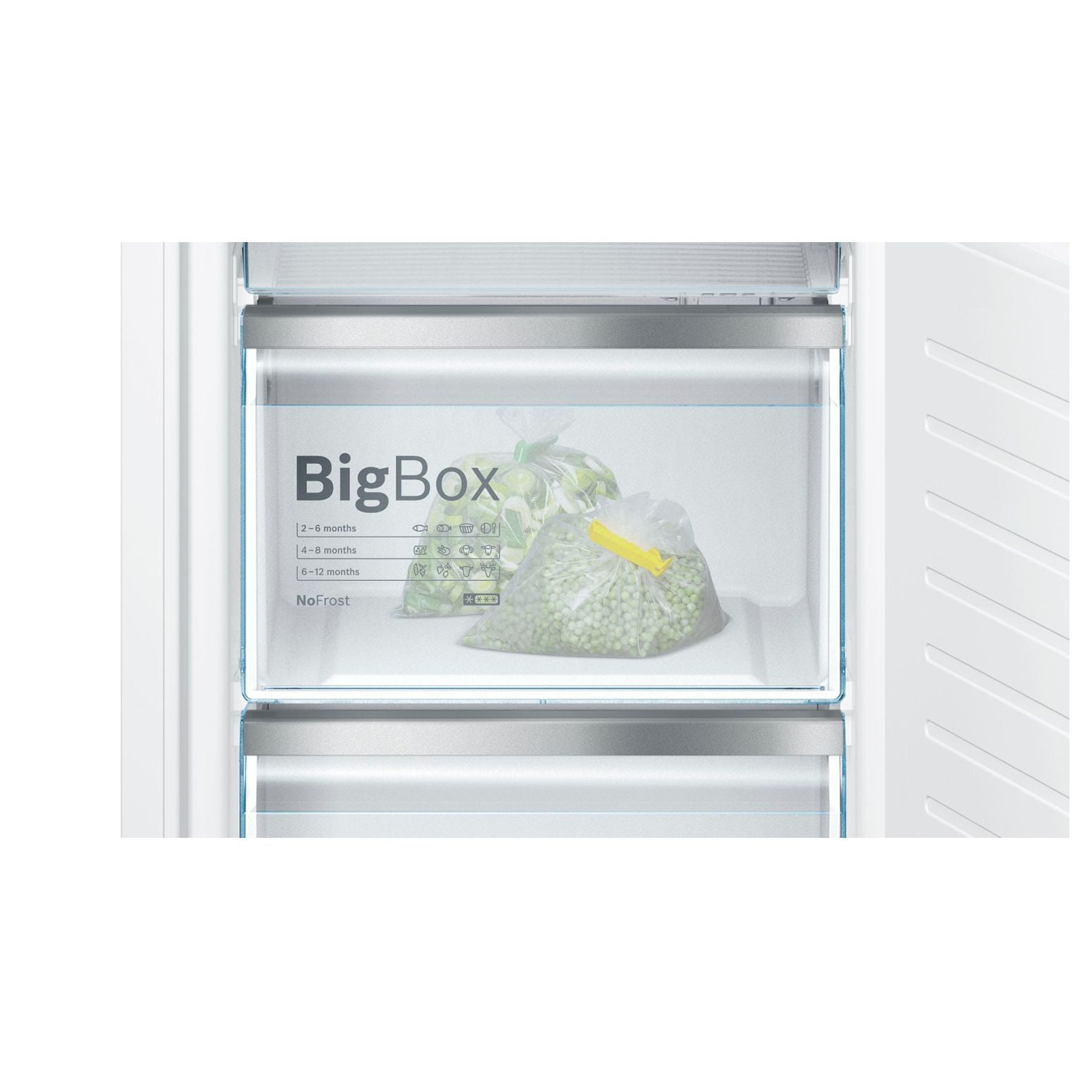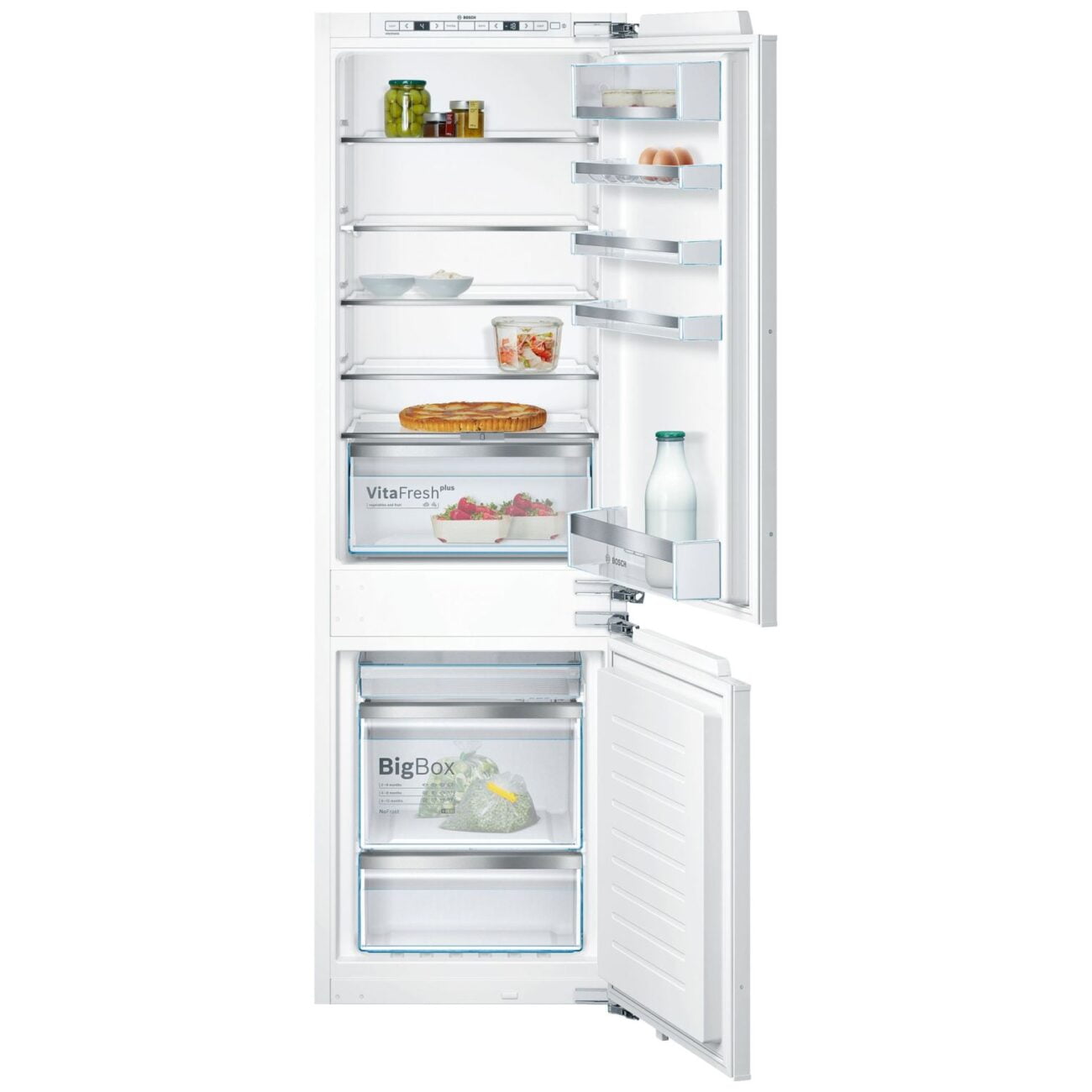 Chłodziarko-zamrażarka, zamrażarka na dole****, pojemność 255l (188+67), W177xS56xG55cm, klasa efektywności energ. A++, 221 kWh/rok, NoFrost, elektroniczna regulacja temperatury, wyświetlacz cyfrowy, oświetlenie LED, osobne sterowanie temperatury w chłodziarce i zamrażarce touchControl, automatyczne odszranianie w chłodziarce i zamrażarce. Chłodziarka: 5 szklanych półek w tym 4 o regulowanej wysokości, 1 dzielona półka VarioShelf, szuflada na warzywa VitaFresh plus, superchłodzenie. Zamrażarka: 3 szuflady w zamrażarce w tym 1 duża typu BigBox, supermrożenie, automatyka zamrażania, system ostrzegania z funkcją pamięć, zdolność zamrażania 8kg/24h, super cicha 39 dB(A) re1pW, zawiasy płaskie.