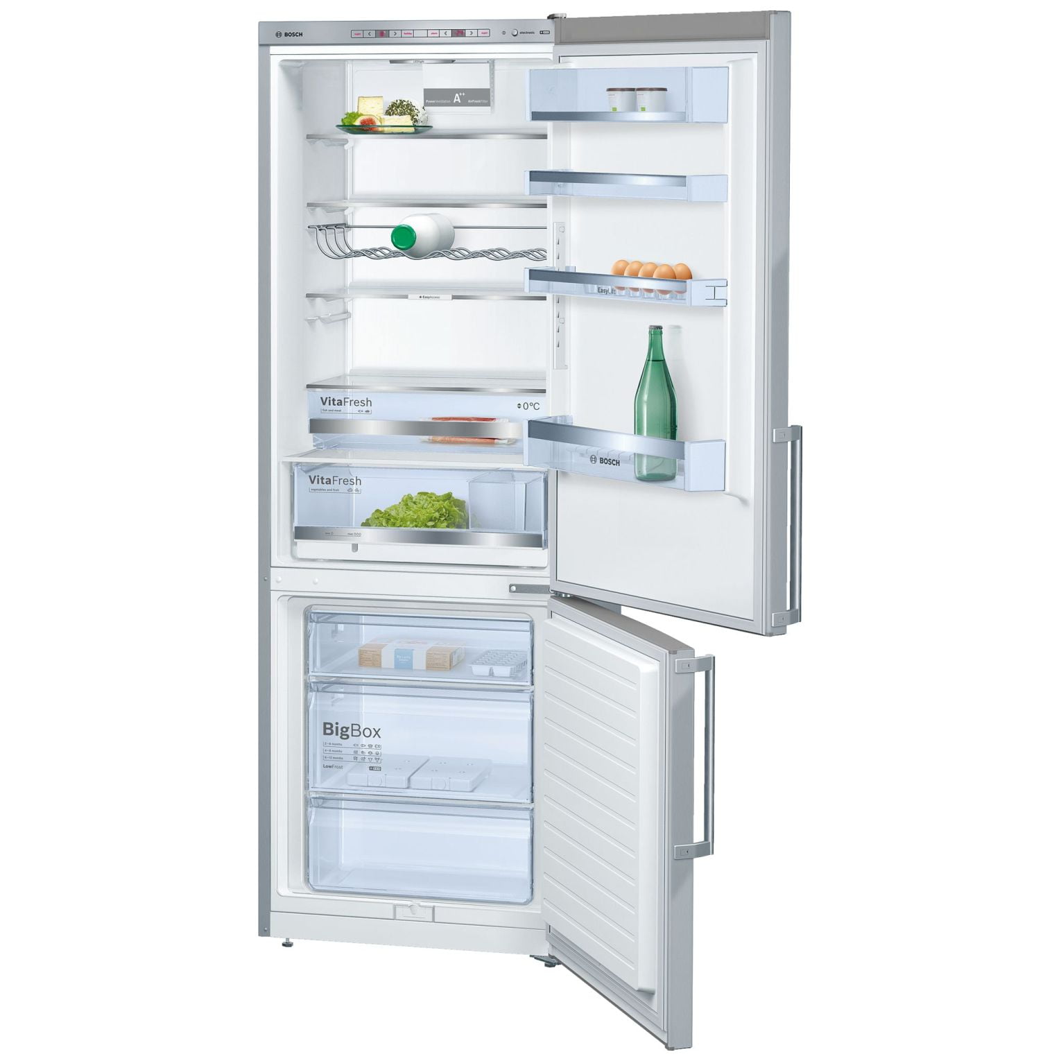 Pojemność 412l (301+111), W201xS70xG65cm, zamrażarka ****, klasa efektywności energ. A++, 255 kWh/rok, elektroniczna regulacja temperatury touchControl, wyświetlacz cyfrowy, 5 szklane półki, chromowany stelaż na butelki, szuflada VitaFresh z regulacją wilgotności, komora VitaFresh <>0°, zamykana górna półka na drzwiach, automatyczne odszranianie w chłodziarce, superchłodzenie, oświetlenie LED, 3 szuflady w zamrażarce w tym BigBox, technologia Low Frost, supermrożenie, zdolność zamrażania 15kg/24h, kolor drzwi: stal szlachetna, powłoka Antifingerprint na drzwiach.