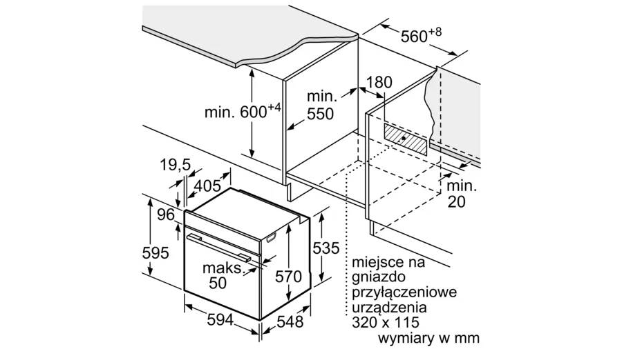 | Wymagana przestrzeń instalacyjna (WxSxG) | 585-595 x 560-568 x 550 mm |