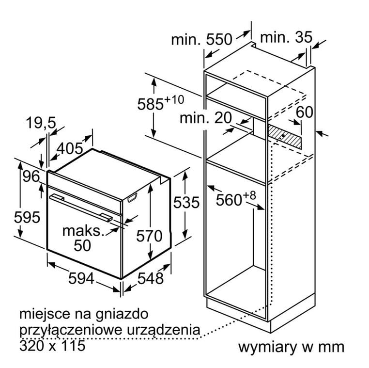 Wymagana przestrzeń instalacyjna (WxSxG) : 585-595 x 560-568 x 550 mm