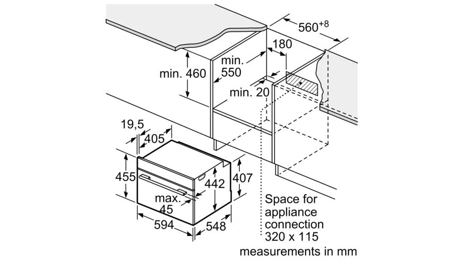 • Minimalny rozmiar wnęki do instalacji (WxSxG): 450-455 x 560-568 x 550 mm