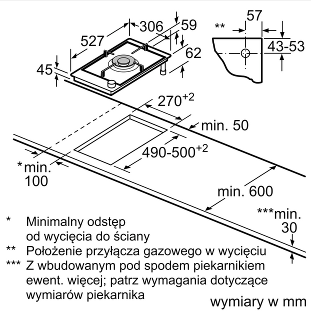 Wymagane wymiary montażowe wnęki (WxSxG mm) : 45 x 270 x (490 – 502)