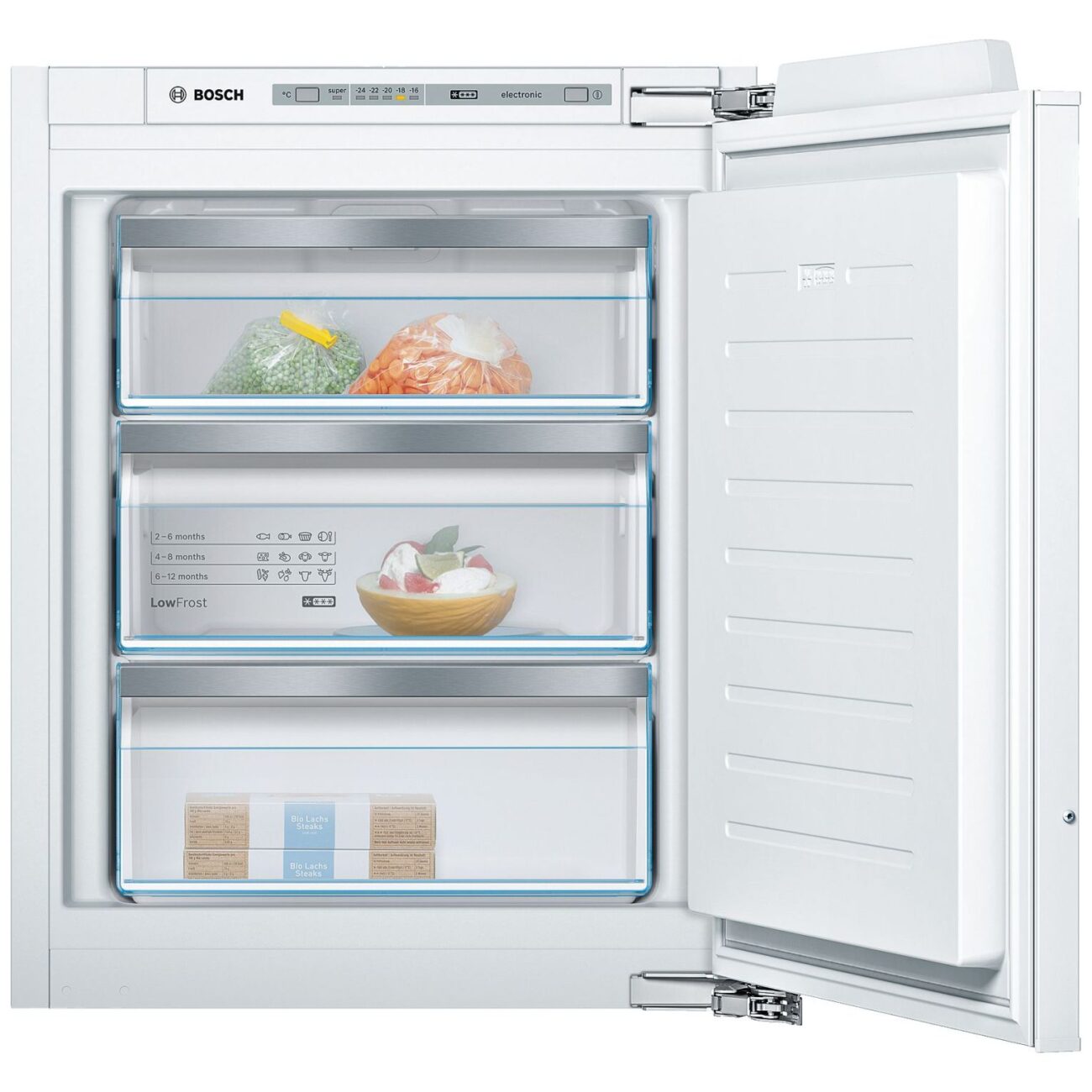 Serie | 6 Zamrażarka, pojemność 72l, W71xS56xG55cm, klasa efektywności energ. A++, 144 kWh/rok, technologia LowFrost, elektroniczna regulacja temperatury, wyświetlacz LED, 3 przezroczyste szuflady, supermrożenie, zdolność zamrażania 8kg/24h, super cicha 36 dB(A) re1pW, zawiasy płaskie.