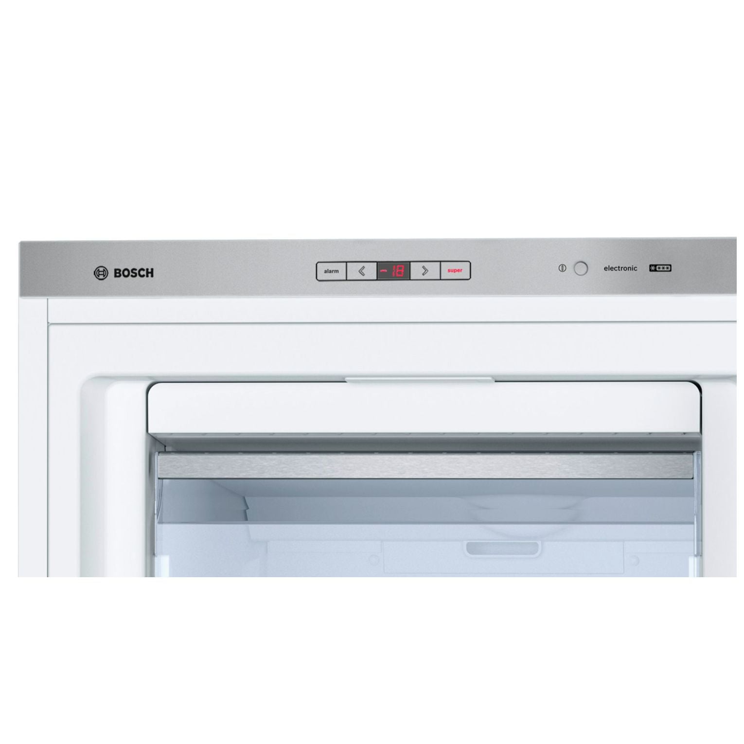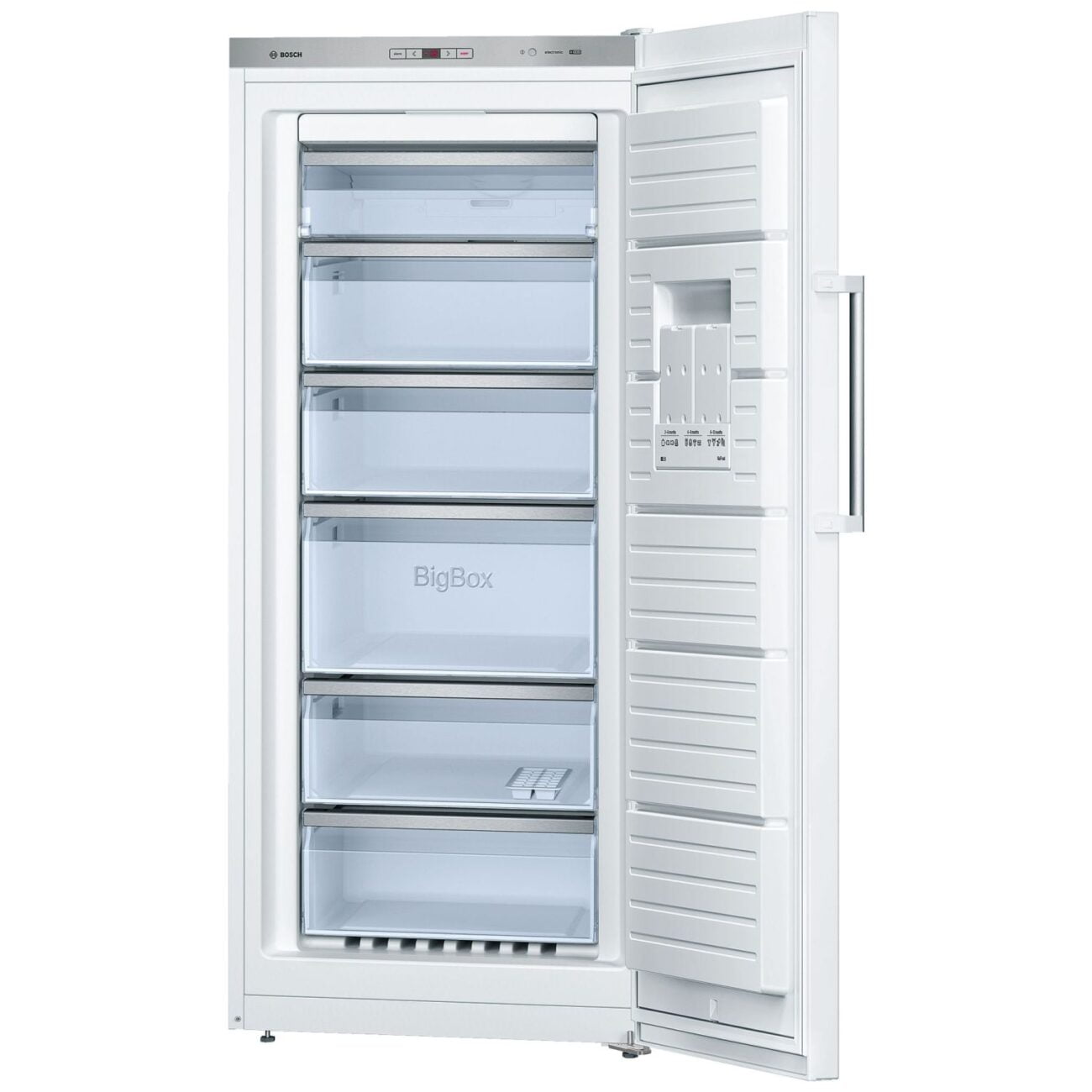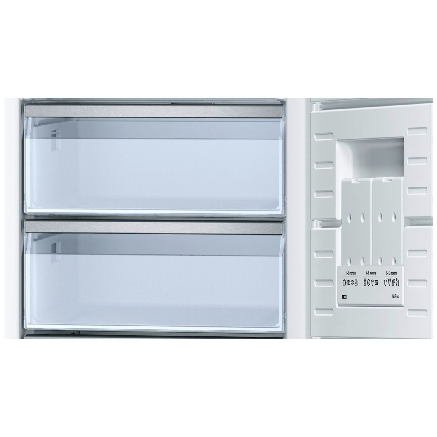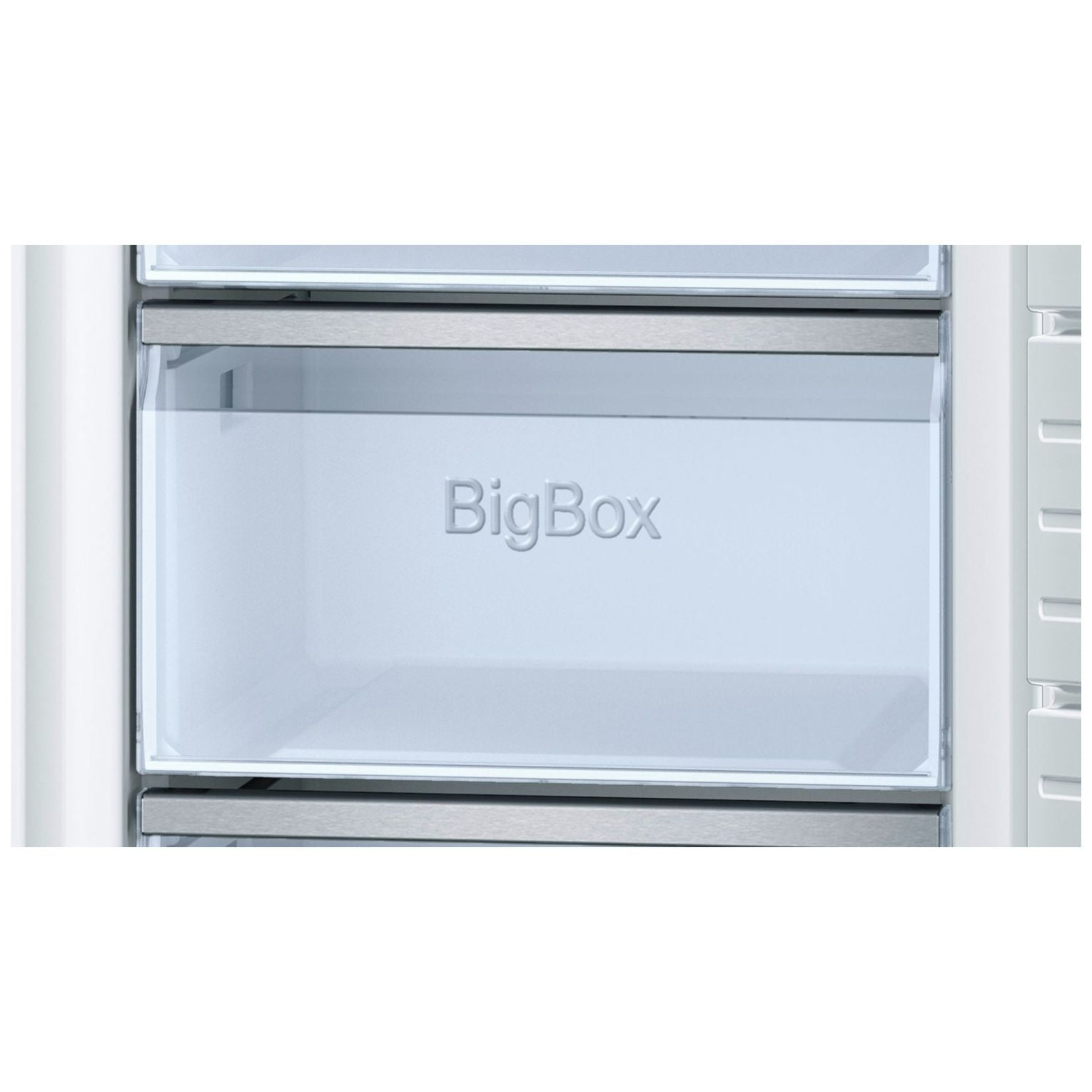 NoFrost, pojemność 286l, W161xS70xG78cm, klasa efektywności energ. A++, 261 kWh/rok, elektroniczna regulacja temperatury TouchControl, wyświetlacz cyfrowy, supermrożenie, zdolność zamrażania 22kg/24h, zdolność przechowywania w przypadku awarii: 25h, 5 szuflad w tym 1 duża typu BigBox + 1 z klapą, oświetlenie wewnętrzne LED, 5 szklanych półek na mrożonki, VarioZone, uchwyt z aluminium, kolor: biały.