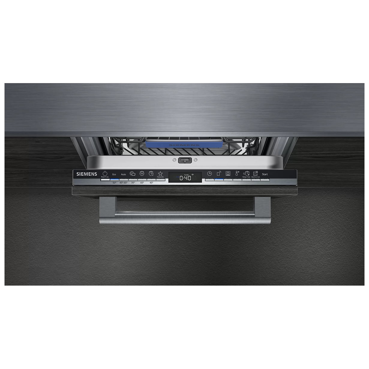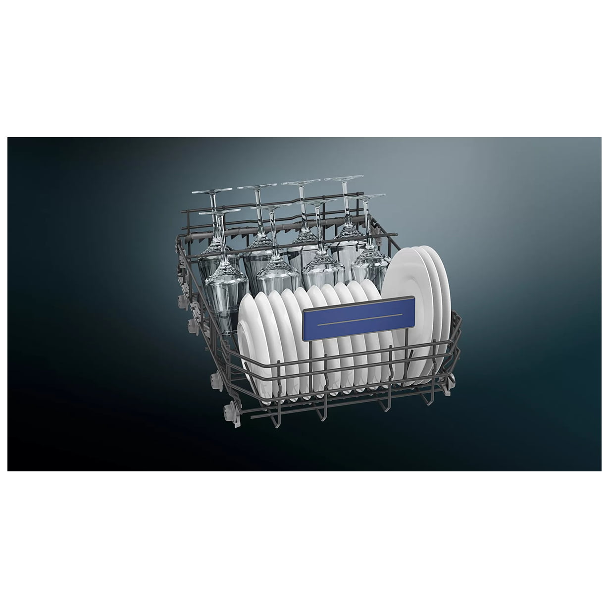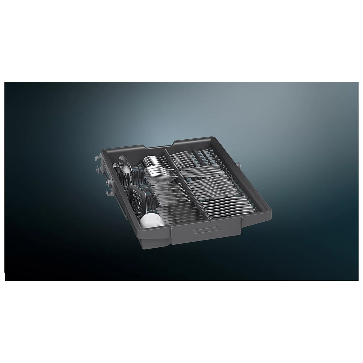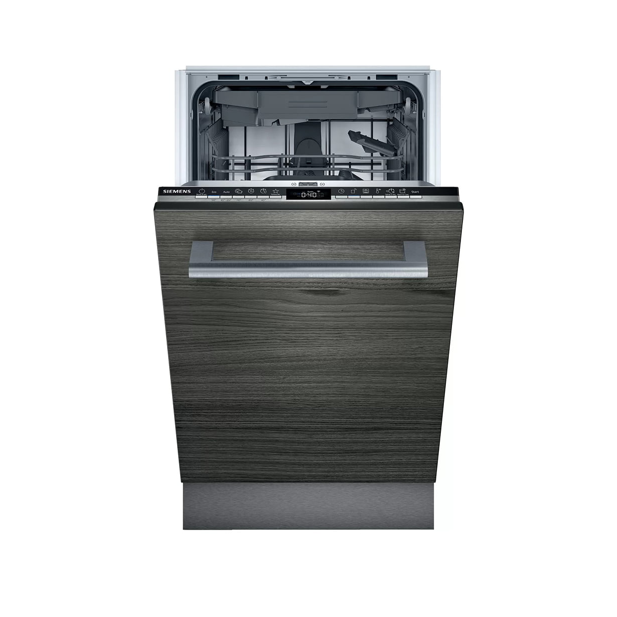 Zmywarka do zabudowy serii iQ300 o szerokości 45 cm w pełni zintegrowana to innowacyjne urządzenie z możliwością zdalnego sterowania za pomocą aplikacji Home Connect. Dodatkowo jeśli ilość tabletek jest niska, aplikacja Home Connect wysle powiadomienie push, przypominając o konieczności uzupełnienia zapasu tabletek. Zmywarka pracuje ze zdwojoną wydajnością dzięki dwóm ramionom zraszającym duoPower® zapewniającym optymalne rozprowadzanie wody. Urządzenie poinformuje Cię o pozostałym czasie zmywania poprzez niebieskie światło infoLight emitowane na podłogę podczas całego procesu zmywania.