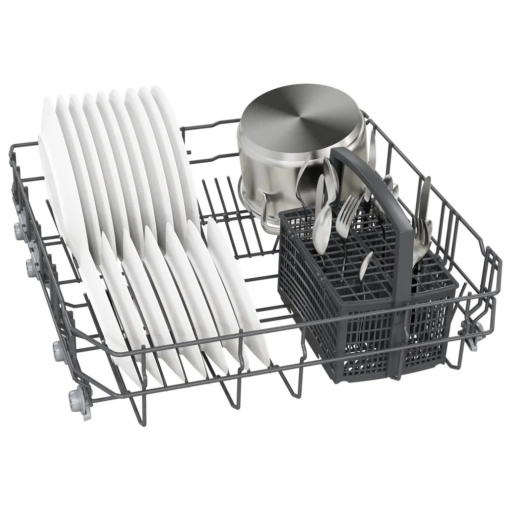 Łatwo regulowana wysokość górnego kosza pozwala znaleźć miejsce na wysokie naczynia i talerze.