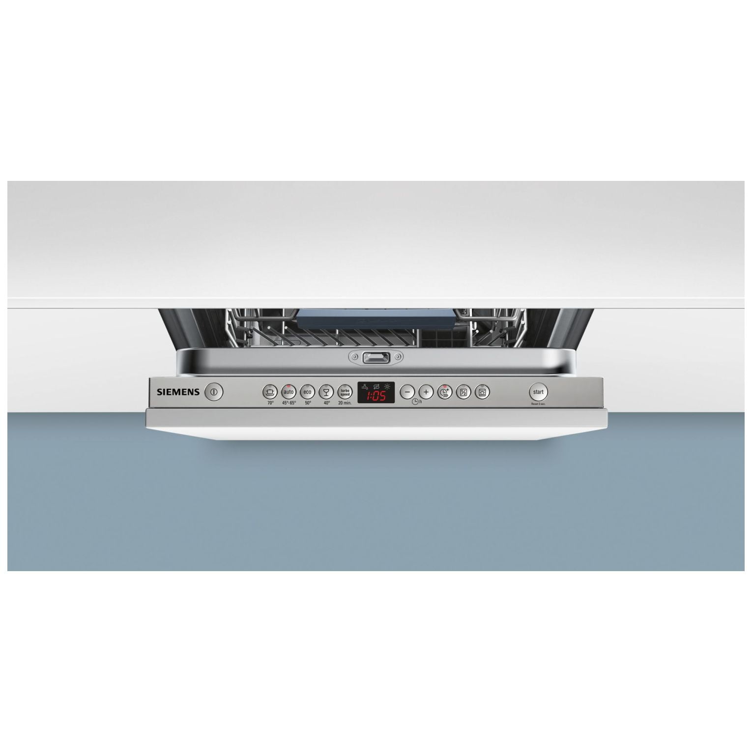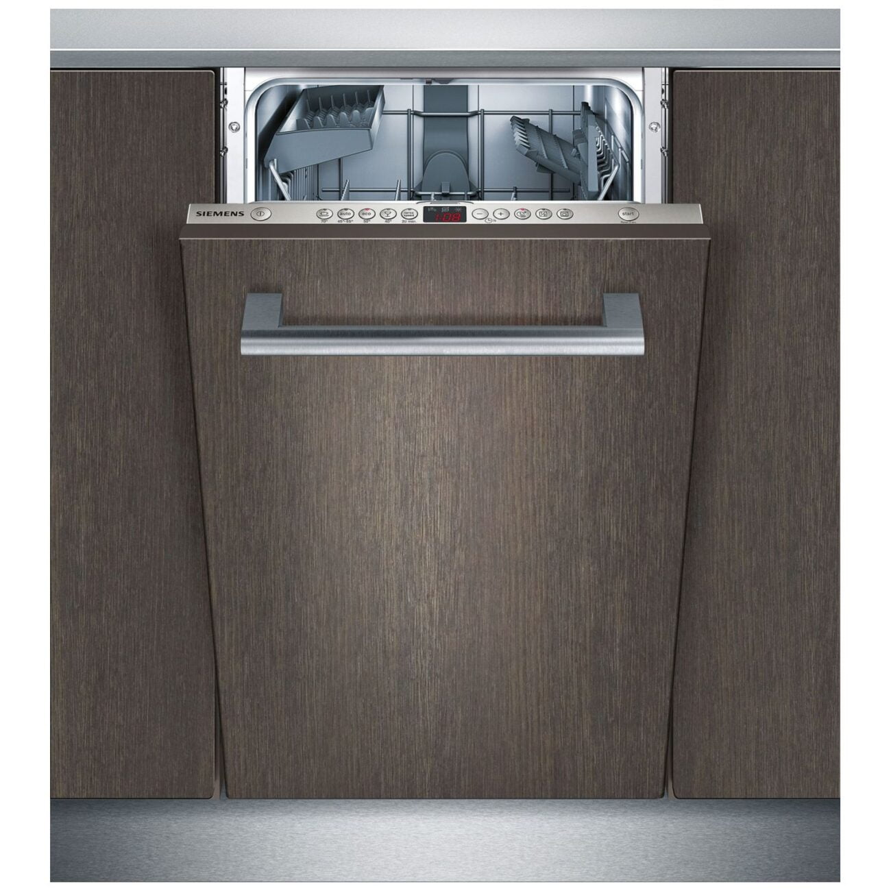 Zmywarka do zabudowy serii iQ500 o szerokości 45 cm w pełni zintegrowana zmywa niezwykle szybko dzięki programowi turboSpeed 20 minut oraz niezwykle oszczędnie, zużywając jedynie 6,5 l wody na cykl. Wygodny i elastyczny załadunek naczyń o różnym kształcie i wielkości umożliwiają kosze varioFlex. Dla tych, którzy nie lubią czekać, aż uzbiera się pełna zmywarka, urządzenie posiada funkcję halfLoad. Zmywarka dopasuje wszystkie parametry cyklu do mniejszej ilości naczyń. Koniec programu zmywania zasygnalizuje sygnał dźwiękowy.